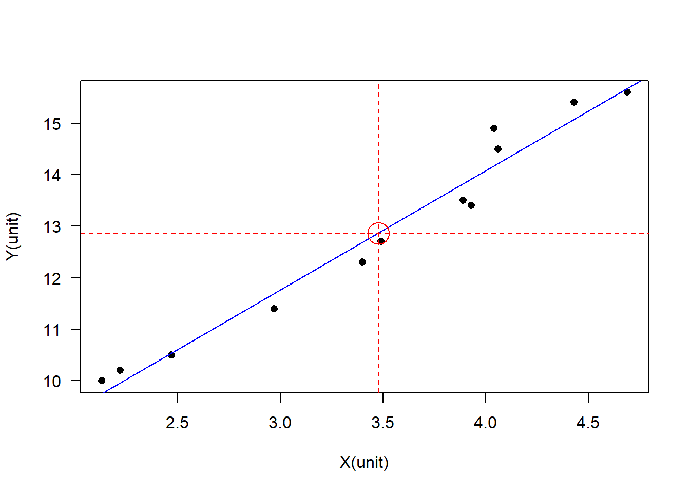 plot(x = dtf$X, y = dtf$Y, xlab = "X(unit)", ylab = "Y(unit)", las = 1, pch = 16)