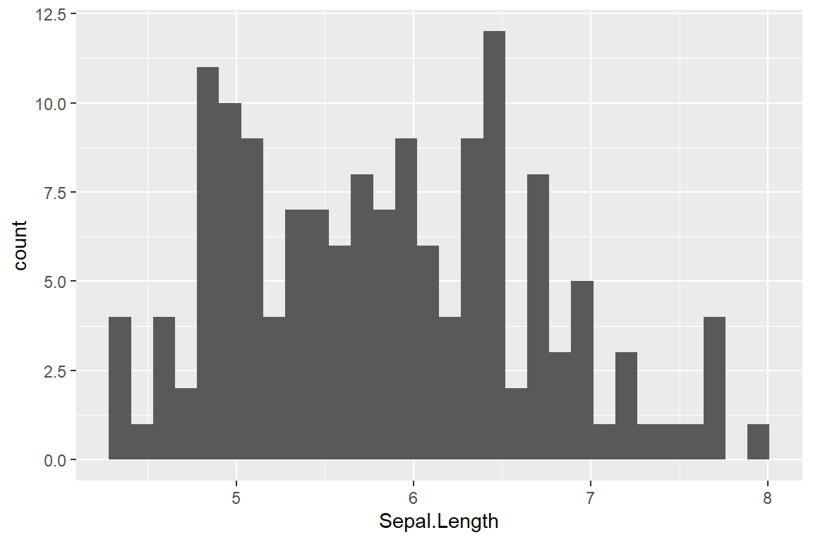 ggplot(iris) + geom_histogram(aes(Sepal.Length))