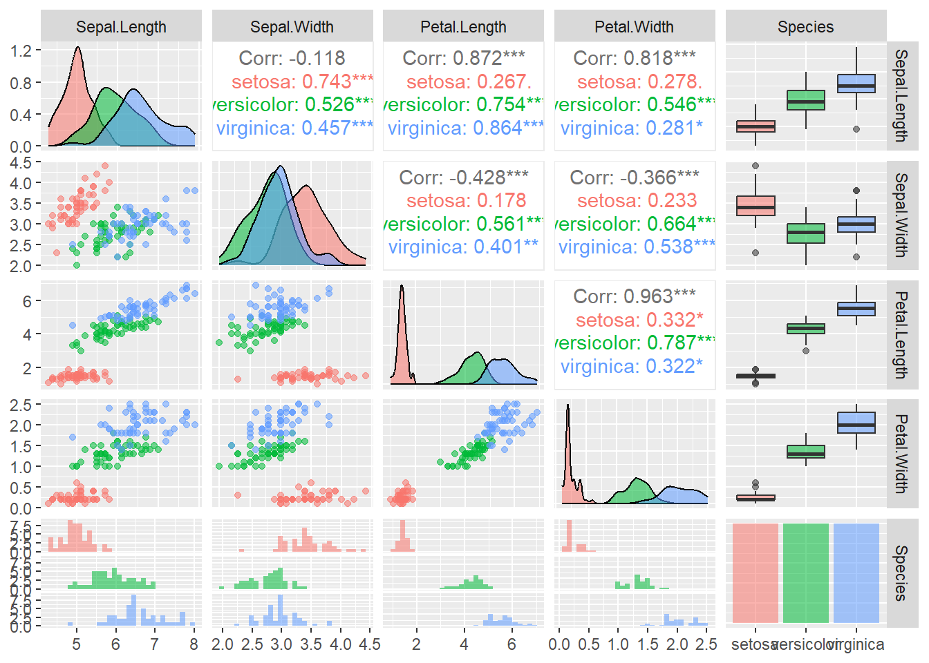ggpairs(iris, aes(colour=Species, alpha=0.5))
