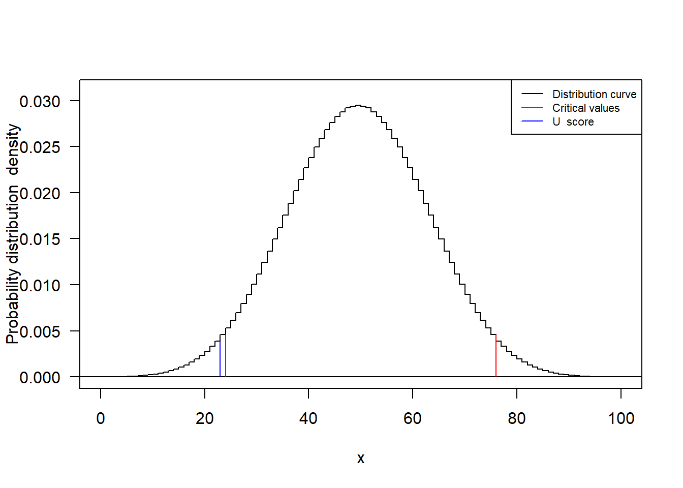 legend('topright', legend = c('Distribution curve', 'Critical values', 'U score'), col = c('black', 'red', 'blue'), lty = 1,cex=0.7)