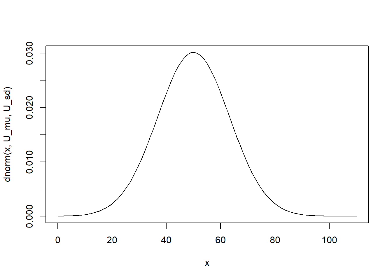 curve(dwilcox(x, m, n), from = 0, to = 100, n = 101, ylab = 'Probability distribution density', las = 1, type = 'S', ylim = c(0, 0.031))