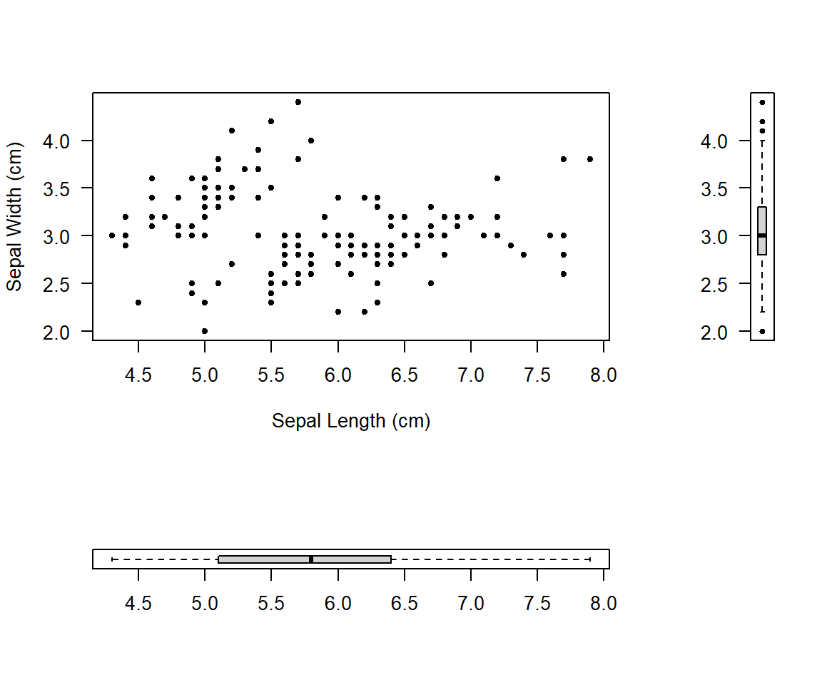 plot(iris$Sepal.Length, iris$Sepal.Width, pch=20, xlab='Sepal Length (cm)', ylab='Sepal Width (cm)', las=1)
