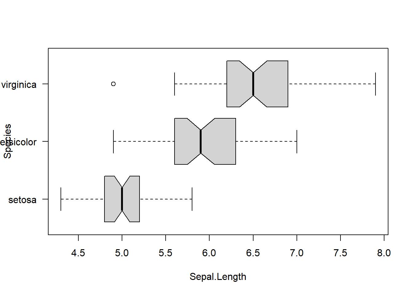 boxplot(iris$Sepal.Length, pch=20, las=1, horizontal=T)